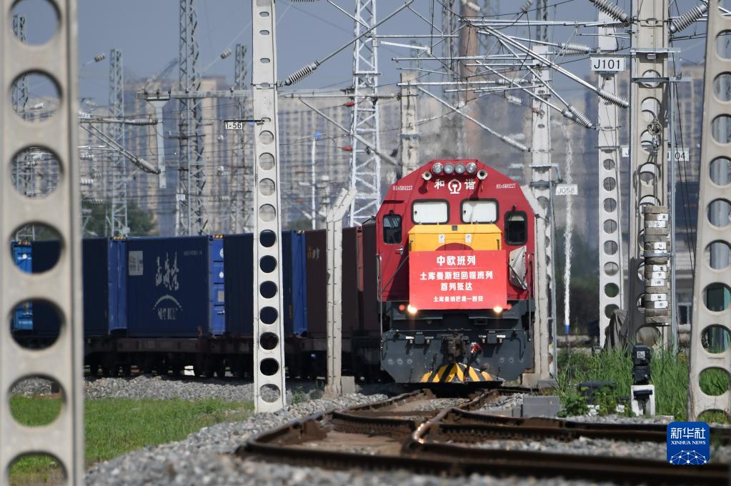 满载土库曼斯坦甘草中药材原料的中欧班列回程列车抵达西安国际港站(2022年8月31日摄)。新华社记者李一博摄