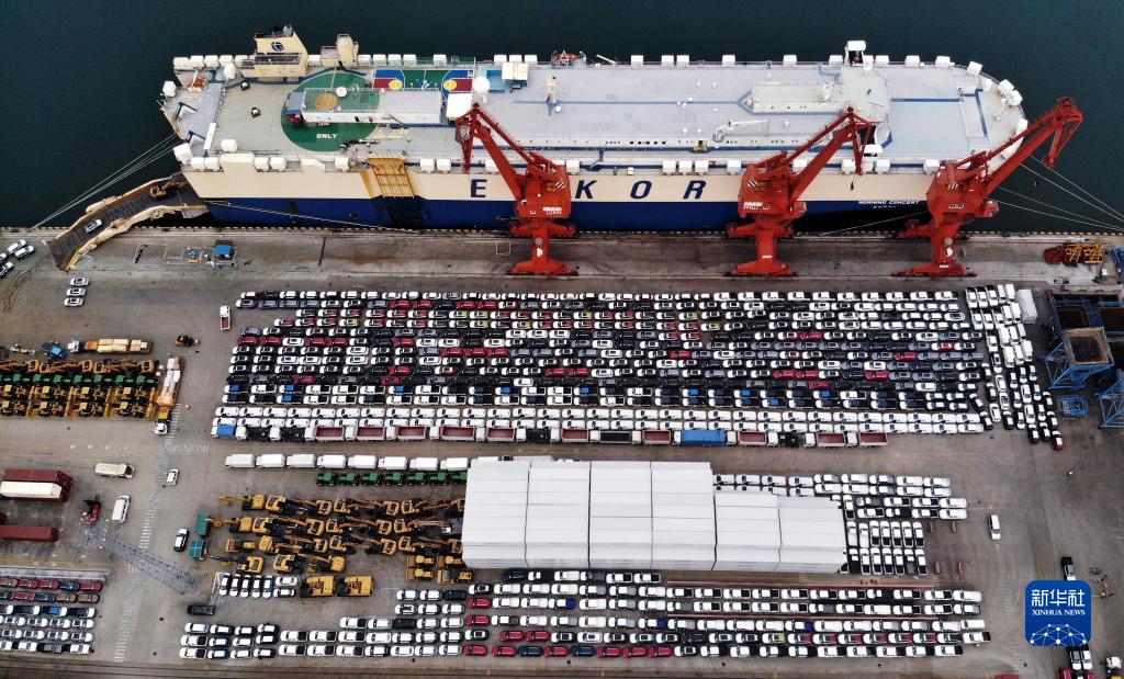 商品车在山东港口青岛港码头等候装船(2022年8月7日摄,无人机照片)。新华社记者李紫恒摄