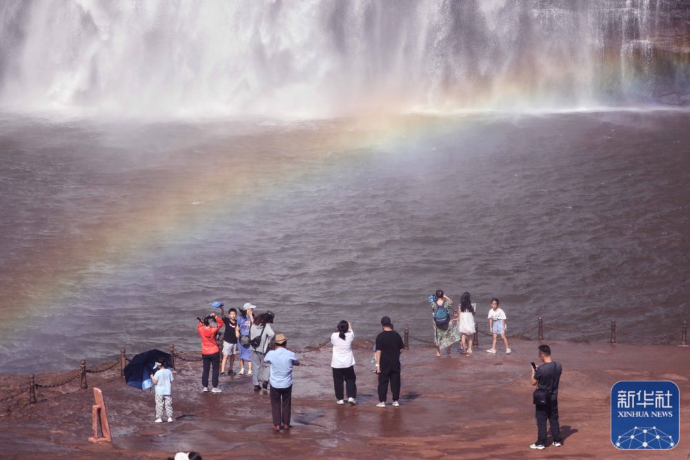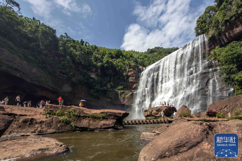 8月3日,游客在赤水丹霞旅游区大瀑布游玩。