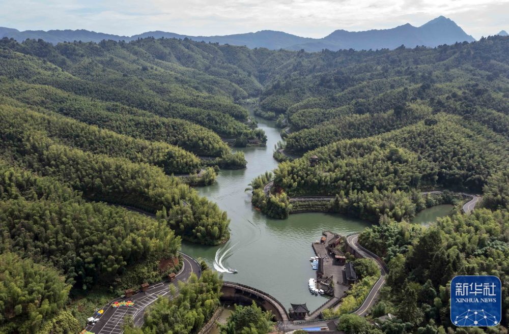 8月3日,游客乘坐快艇在赤水竹海国家森林公园竹海湖上游览。