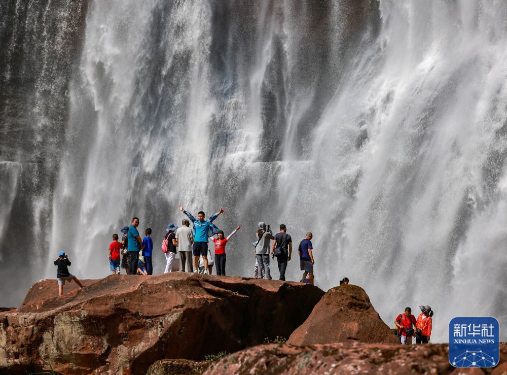 8月3日,游客在赤水丹霞旅游区大瀑布游玩。