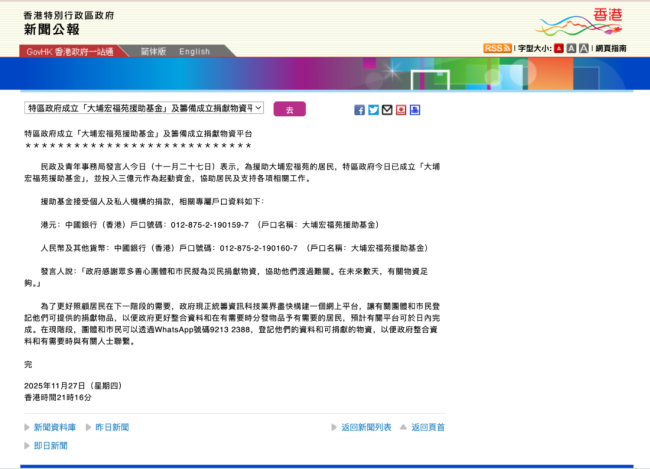 庄永编介绍说,香港特别行政区政府于11月27日宣布正式成立「大埔宏福苑援助基金」,并投入三亿元作为起动资金,用于协助受灾居民及支持各项紧急与后续工作,并筹备成立物资捐献平台。