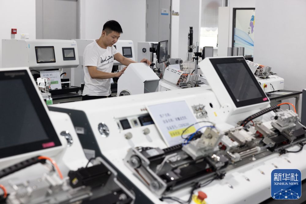 在临港新片区生命科技产业园一处医疗设备生产车间,工人在调试医疗设备(8月18日摄)。新华社记者金立旺摄