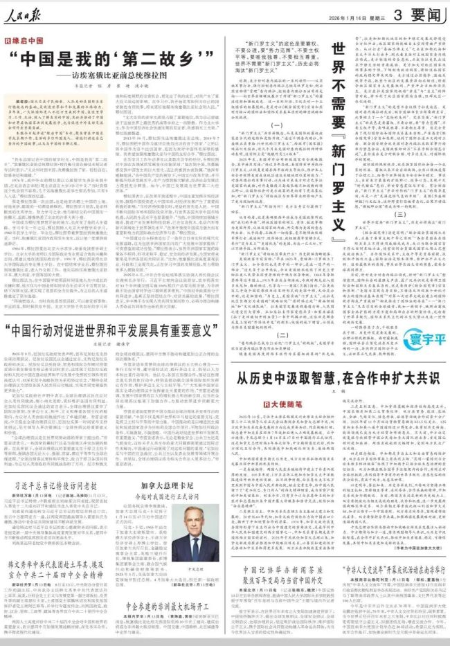 2026年1月14日,驻加拿大大使王镝在《人民日报》发表大使随笔《从历史中汲取智慧,在合作中扩大共识》。全文如下: