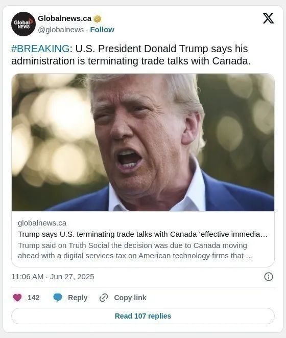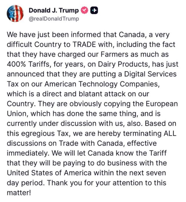美国总统唐纳德·特朗普表示,他的政府将“立即生效”终止与加拿大的贸易谈判。特朗普在“真相社交”(Truth Social)上表示,这一决定是由于加拿大正在推进对在加拿大运营的美国科技公司征收数字服务税。他表示这一决定是由于加拿大——他称之为“一个非常难以与之进行贸易的国家”——正在推进对在加拿大运营的美国科技公司征收数字服务税。