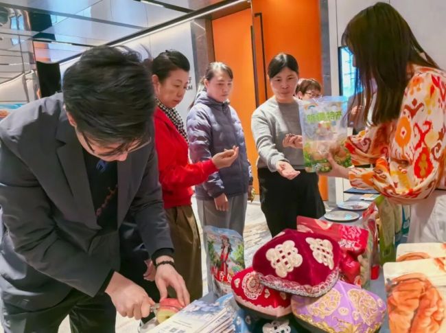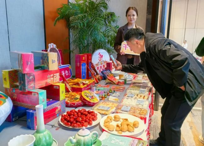 会场一侧,苹果、核桃、红枣等特色农副产品,以及精美的文创、非遗产品整齐摆放,吸引众人驻足品尝、欣赏。