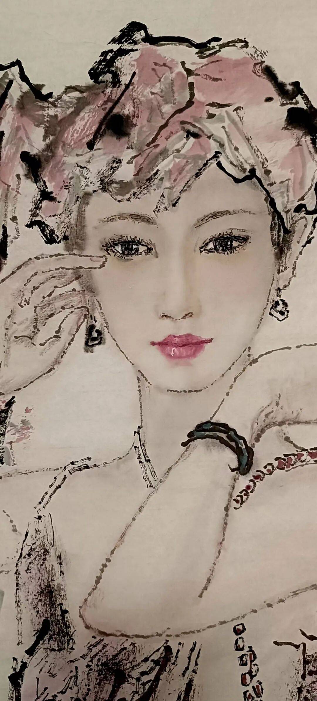 你看这画里的姑娘:没有传统仕女的“古板模板”,而是带着都市女性的灵动眼神,可那衣褶里的水墨线条,又藏着顾恺之“春蚕吐丝”的古意;西方解剖学撑出的立体肩颈、肌肤的光影晕染,是他从卢浮宫获奖作品《贵妃醉酒》里延续的“中西合璧杀”——既有古希腊人体的舒展,又有东方水墨的缥缈,这才是“薛氏美神”的精髓:把现代美人画成了能呼吸的东方韵。