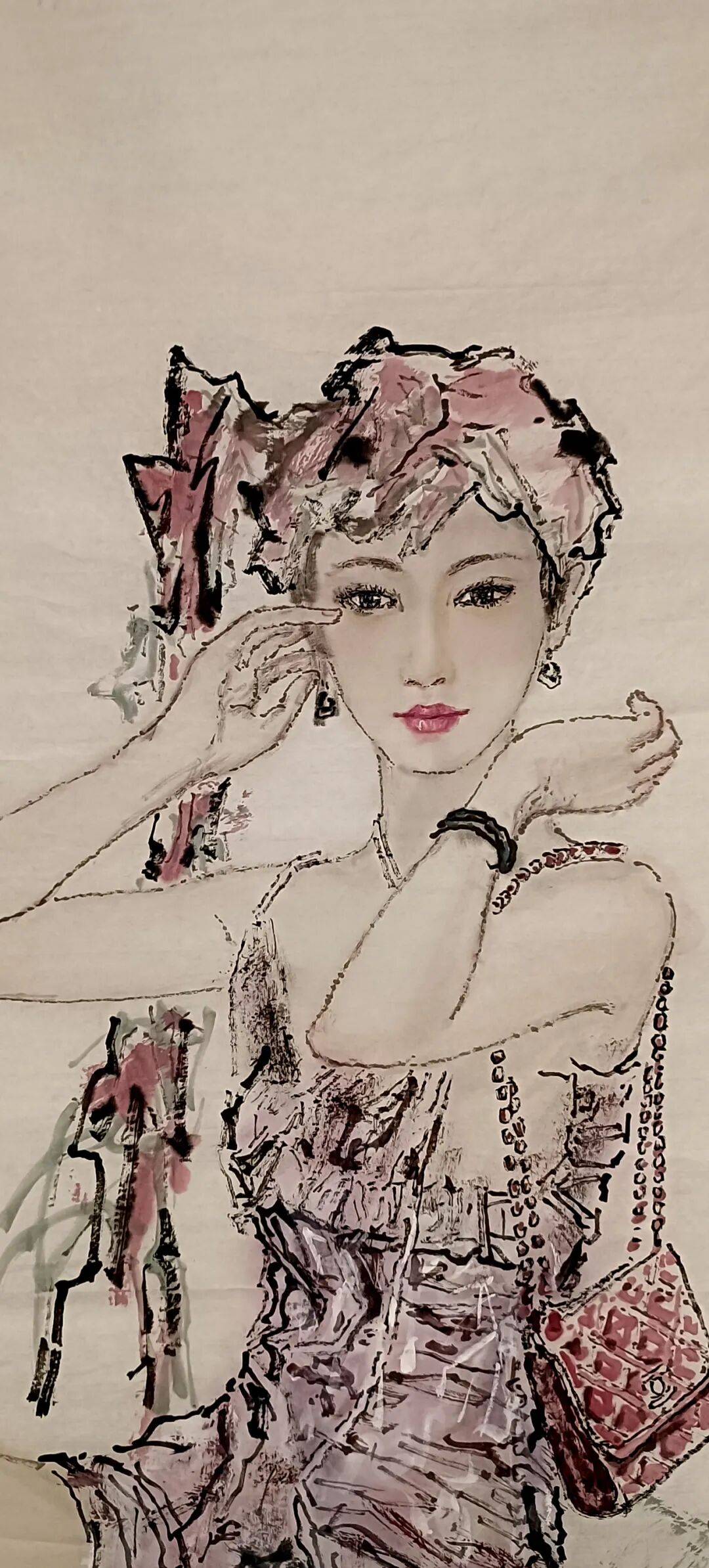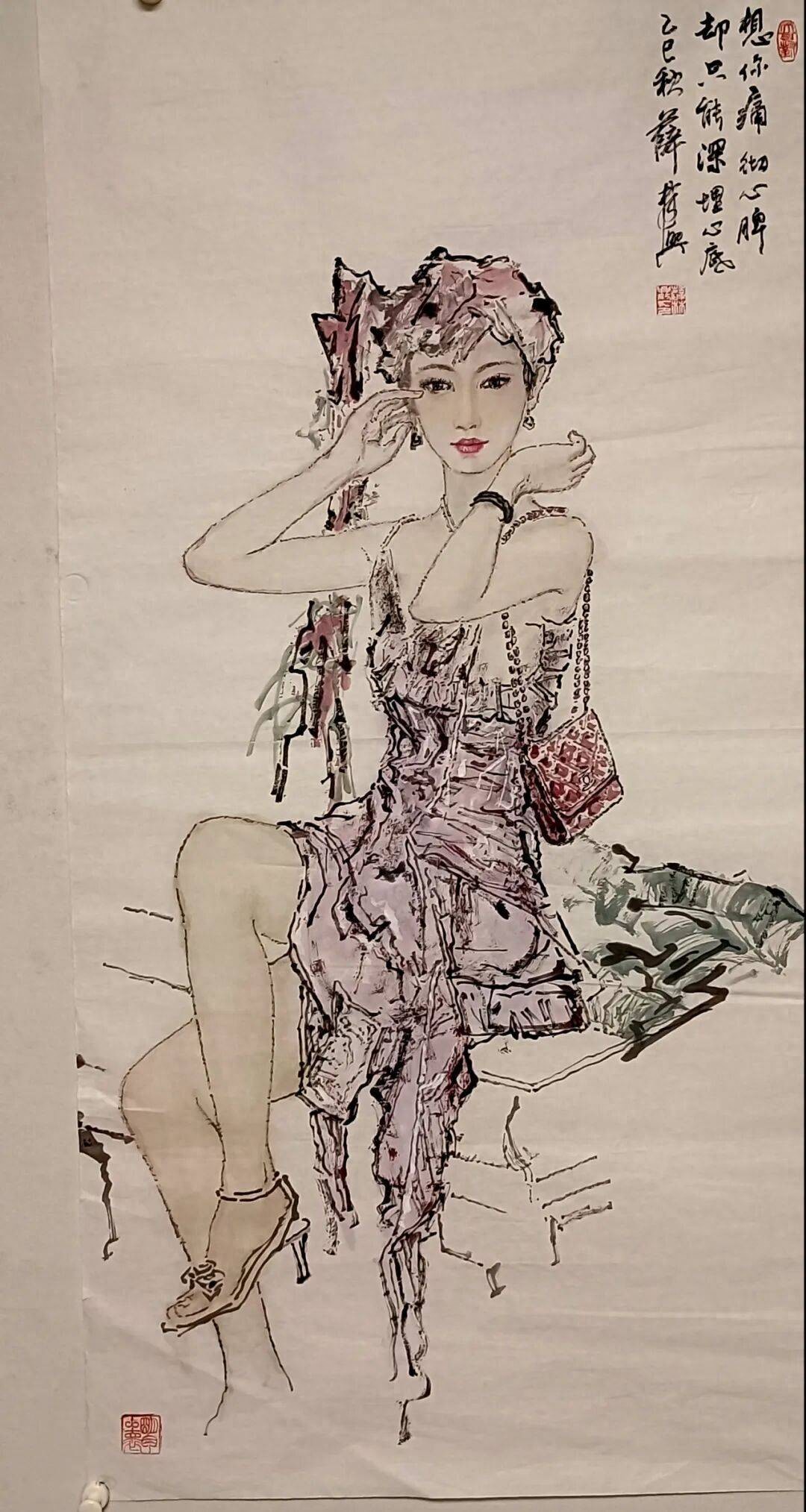 再看细节:裙装的紫调泼墨裹着亮片肌理,包包的红纹撞色带着现代时尚感,题字“想你痛彻心扉,却只能深埋心底”又藏着当代人的情绪共鸣——他早跳出了“画古代仕女”的框,用传统笔墨讲活了当下的美,这才是“新仕女画”能在拍卖场里从“百万级”往“千万级”冲的底气(毕竟他的作品可是被政协办公厅收藏、当国礼送首脑的)。