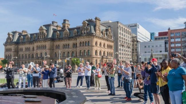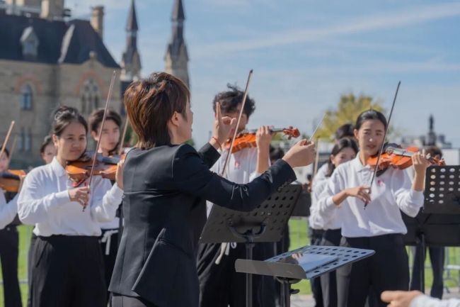9月24日,乐团的年轻音乐家们现身加拿大政治中心——国会山。在象征着团结与希望的百年圣火台前,他们举行了一场充满活力的快闪演出。当《茉莉花》、《第二号丹松舞曲》等经典旋律在广场上空飘扬时,许多当地市民和游客被深深吸引,纷纷举起手机记录下这难忘的时刻。这场成功的演出也为后续正式音乐会进行了预热。