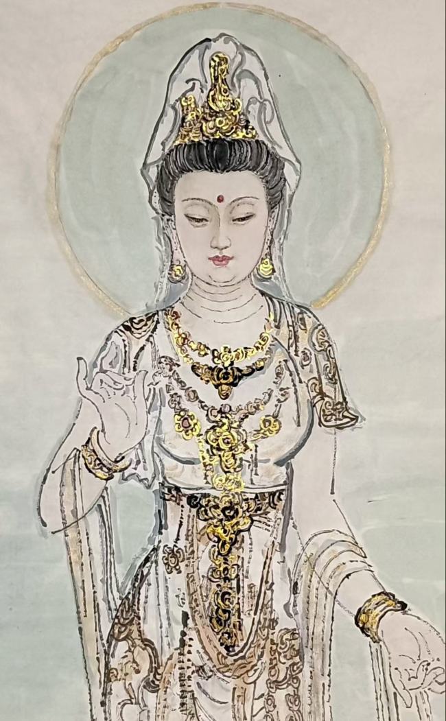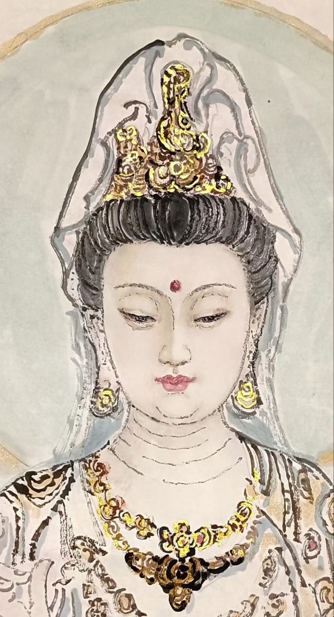 作品打破传统佛像画的程式化表达,将观音的“神性”与“人性”结合,是当代宗教绘画创新的范例,兼具宗教文化内涵与现代审美价值;这类融合型宗教题材作品,既受传统藏家认可,也被当代艺术收藏市场关注,文化属性提升了收藏的多元价值。