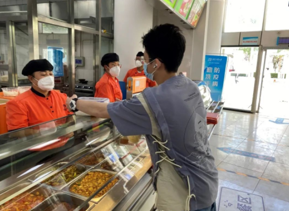 学校疫情防控应急指挥部成立工作专班,统筹制定了物资保障、场地改造、菜品优化、宣传引导等工作方案,克服地处被中高风险地区合围的物流运输困难,采购了1.4万套餐盒餐具,为所有在校师生发放到位,倡导师生自带餐盒、减少使用一次性餐具,同时在办公楼宇和学生公寓增设厨余垃圾桶,引导师生购餐后带回办公场所或宿舍用餐。在学校各食堂现场,门帘已全部拆除,就餐区的桌椅收撤到位。校园内,由学校艺术设计学院学生绘制的“助力防疫,暂停堂食”“暂时不聚,为了更好相聚”等海报吸引着师生驻足观看。暂停堂食首日,教职工党员先锋队和学生志愿先锋队共80人次,在各食堂入口和大厅轮值,提醒购餐师生严格测温通行、单向出入、带好口罩、保持两米线。