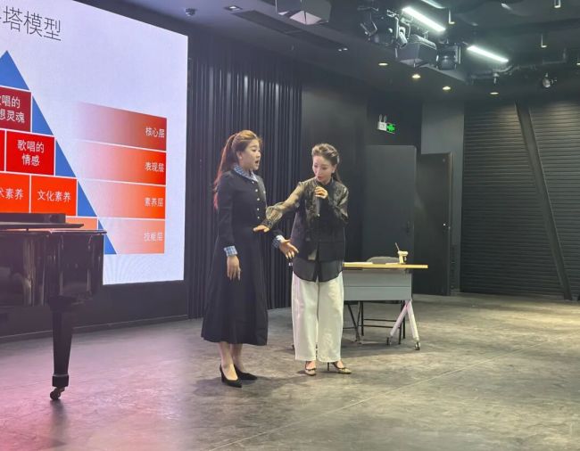 讲座中,李琳老师结合丰富的教学经验与生动的现场示范,深入浅出地阐述了“金字塔模型”的内涵。她指出,歌唱不仅是技巧的呈现,更是文化、情感与思想的融合表达。在随后的公开课环节,我系大二“优才计划”的十位同学依次登台演唱,李琳老师逐一进行细致指导,精准指出每位同学在气息、咬字、共鸣、情感表达等方面存在的问题,并现场示范调整,教学效果显著。