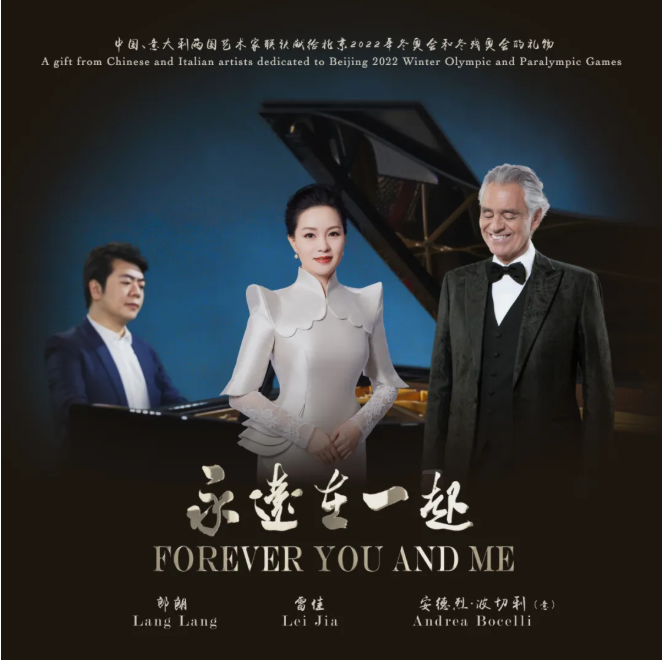 北京时间2022年2月7日,正值北京冬奥会之际,中共北京市委宣传部、北京市文学艺术界联合会、北京音乐家协会共同推出冬奥主题单曲《永远在一起》(Forever You and Me)。这首歌曲《永远在一起》作为中国、意大利两国艺术家联袂献给北京2022冬奥会和冬残奥会的礼物,由著名词曲作家张和平、舒楠联袂打造,中国著名女高音雷佳与意大利著名男高音安德烈·波切利共同演唱,著名钢琴演奏家郎朗担任钢琴演奏。