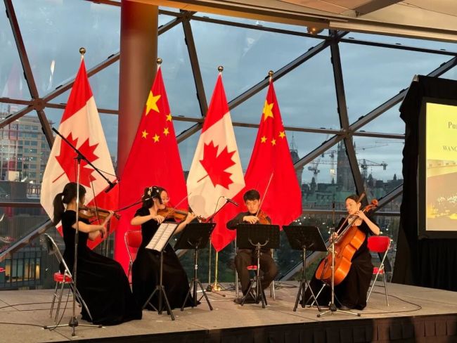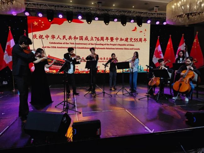9月26日晚,四名学生组成的弦乐四重奏在中国驻加拿大大使馆国庆招待会上献演